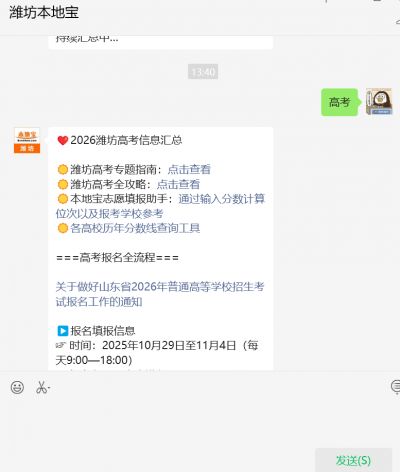 温馨提醒:微信搜索【潍坊本地宝】微信公众号,关注后在聊天对话框发送【高考】,即可获取2026山东/潍坊市普通高考报名及考试总指南,考试时间、考点安排、成绩查询、高考分数线查询入口、志愿填报时间+入口、录取结果查询时间+入口、各招生考试院联系方式等高考全攻略。(持续更新中)