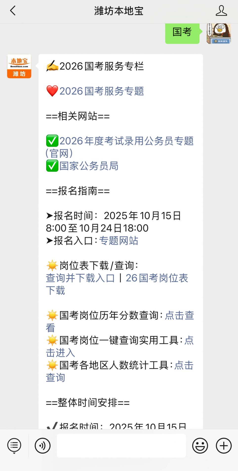 温馨提示:微信搜索关注【潍坊本地宝】,在对话框发送【国考】,即可获取2026国考报名公告、岗位表查询/下载/筛选工具、报名时间及入口、考试时间、准考证打印入口、成绩查询指南、面试公告、补录通知、官网入口等信息(持续更新)